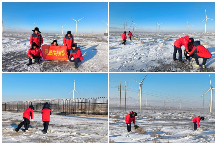 同一時(shí)間,公司第三黨支部也在達(dá)坂城風(fēng)電場區(qū)域開展志愿勞動活動。大家在完成機(jī)組運(yùn)維工作的間隙,主動拿起工具,清理場站周邊道路及公共區(qū)域的垃圾。大家不畏嚴(yán)寒,以高度的責(zé)任感和團(tuán)隊(duì)協(xié)作精神,迅速投入到垃圾清撿工作中,對角落及設(shè)備周邊的垃圾進(jìn)行細(xì)致清理,確保每一處通道都安全暢通,每一臺設(shè)備都能正常運(yùn)行。忙碌的身影在場站中穿梭,與遠(yuǎn)處旋轉(zhuǎn)的風(fēng)機(jī)遙相呼應(yīng),共同構(gòu)成了一幅冬日里充滿溫情與力量的畫卷。