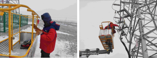 在暴風(fēng)雪期間,風(fēng)電場(chǎng)的應(yīng)急響應(yīng)機(jī)制發(fā)揮重要作用。當(dāng)值人員發(fā)現(xiàn)Y2機(jī)組報(bào)三相電壓不平衡故障時(shí),迅速行動(dòng),經(jīng)現(xiàn)場(chǎng)檢查確認(rèn)為隔離刀閘脫落故障。風(fēng)電場(chǎng)立即組織人員準(zhǔn)備工器具,結(jié)合風(fēng)速預(yù)測(cè)和現(xiàn)場(chǎng)風(fēng)速變化情況,利用倒風(fēng)向的窗口期進(jìn)行了倒閘操作,并利用登高車(chē)對(duì)Y2機(jī)組隔離開(kāi)關(guān)進(jìn)行了處理。整個(gè)過(guò)程,從停送電操作到故障處理,僅用了20分鐘,完美的詮釋了什么叫做“風(fēng)能速度”。