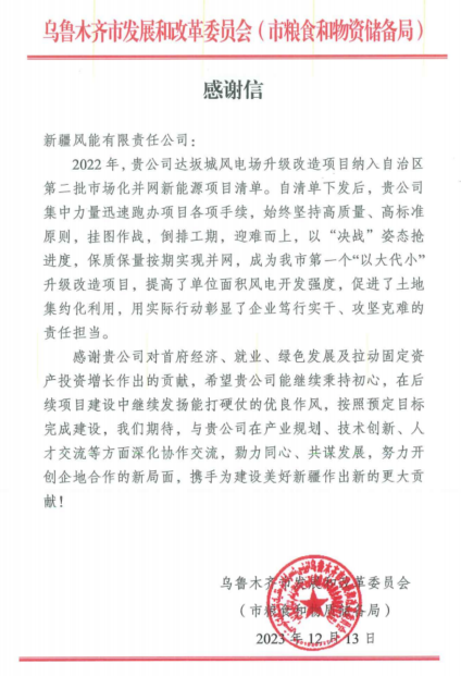 (通訊員 朱鑫鑫/攝影 龔俊屹)12月13日,風(fēng)能公司收到烏魯木齊市發(fā)展和改革委員會(huì)(市糧食和物資儲(chǔ)備局)發(fā)來(lái)的感謝信,信中對(duì)風(fēng)能公司達(dá)坂城升級(jí)改造項(xiàng)目在自治區(qū)第二批市場(chǎng)化并網(wǎng)新能源項(xiàng)目中保質(zhì)保量保時(shí)完成并網(wǎng),為首府經(jīng)濟(jì)、就業(yè)、綠色發(fā)展及拉動(dòng)固定資產(chǎn)投資增長(zhǎng)作出的貢獻(xiàn)表示高度肯定和感謝。
